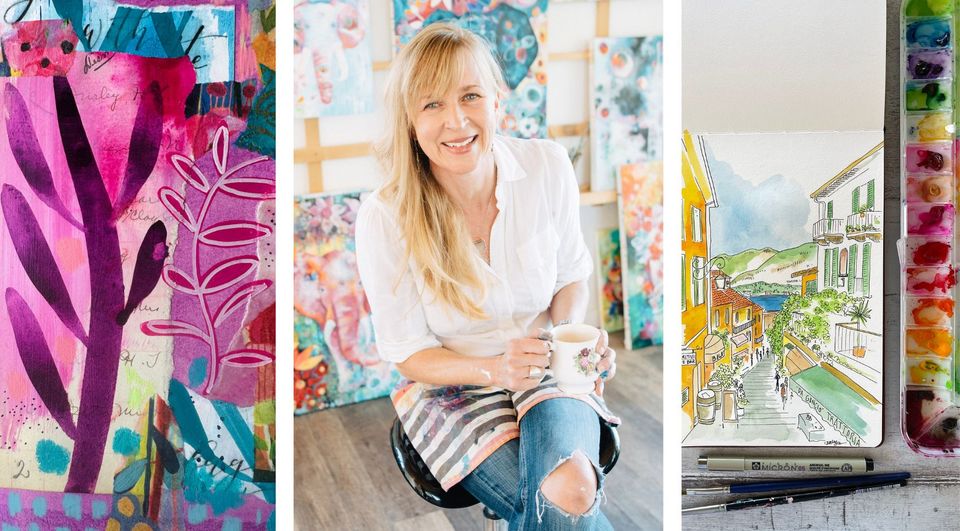Andrea Garvey is a California-based artist, teacher, and retreat leader who inspires creativity through vibrant color, joyful mark-making, and intuitive mixed-media explorations. After over two decades as a creative director in corporate life, Andrea followed a deeply personal call. At age 50, she transitioned into full-time artmaking and teaching, and she’s never looked back.